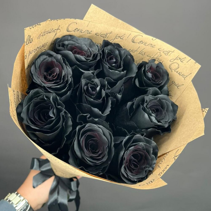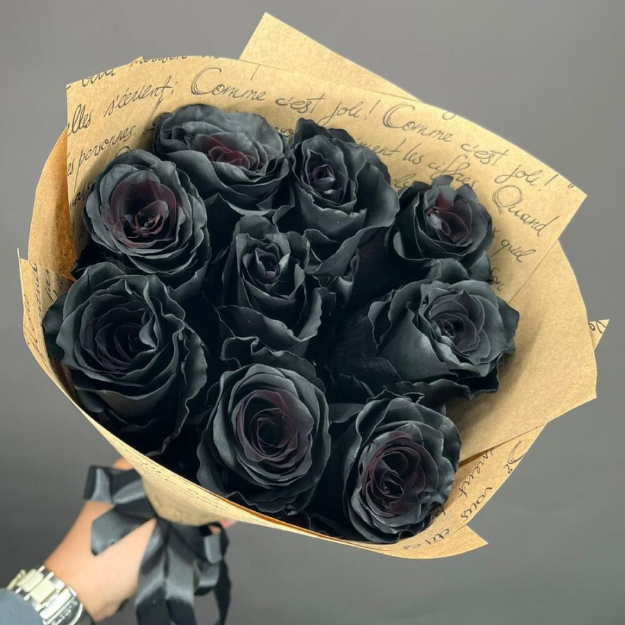 На фото букет из 9 черных роз. В составе: роза 9 шт, дизайнерская упаковка 1 шт, атласная лента 1 шт, . Все цветы свежие и ароматные, букет красиво оформлен и отлично подходит для подарка. Доступна доставка цветов или самовывоз.