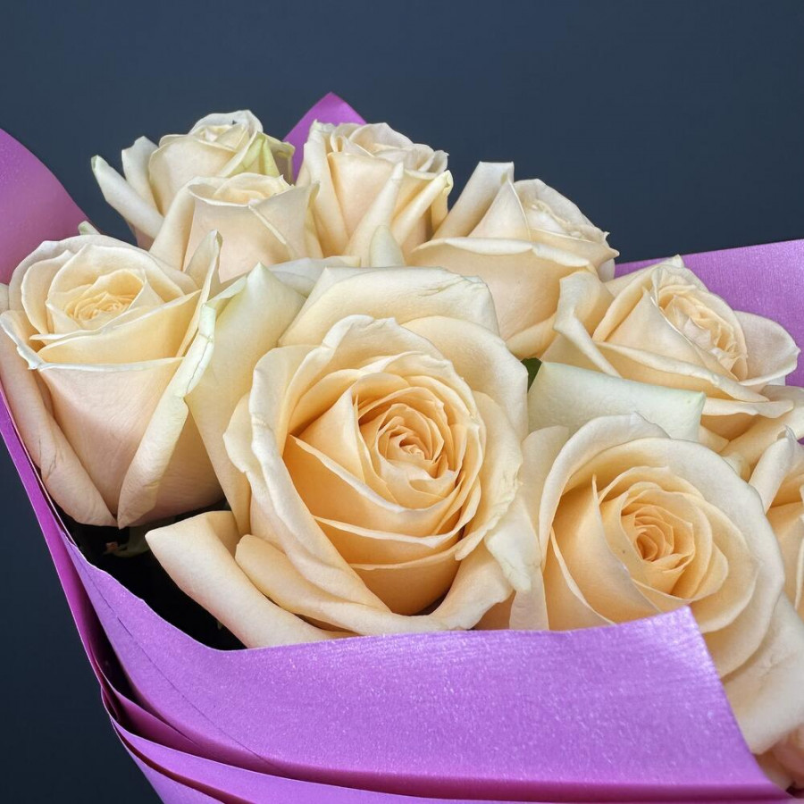 На фото букет из 9 кремовых роз. В составе: роза 9 шт, фоамиран 2 шт, атласная лента 1 шт, . Все цветы свежие и ароматные, букет красиво оформлен и отлично подходит для подарка. Доступна доставка цветов или самовывоз.