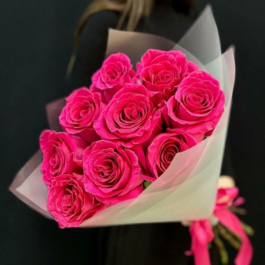На фото букет из 9 малиновых роз. В составе: роза 9 шт, крафт-бумага 1 шт, атласная лента 1 шт, . Все цветы свежие и ароматные, букет красиво оформлен и отлично подходит для подарка. Доступна доставка цветов или самовывоз.