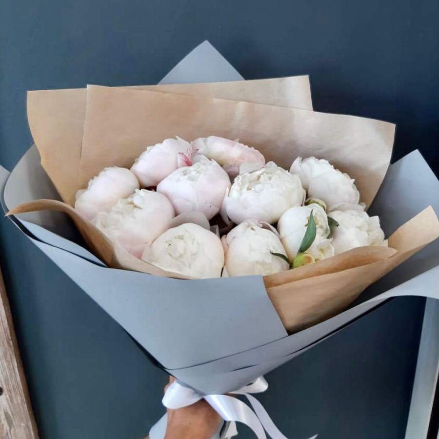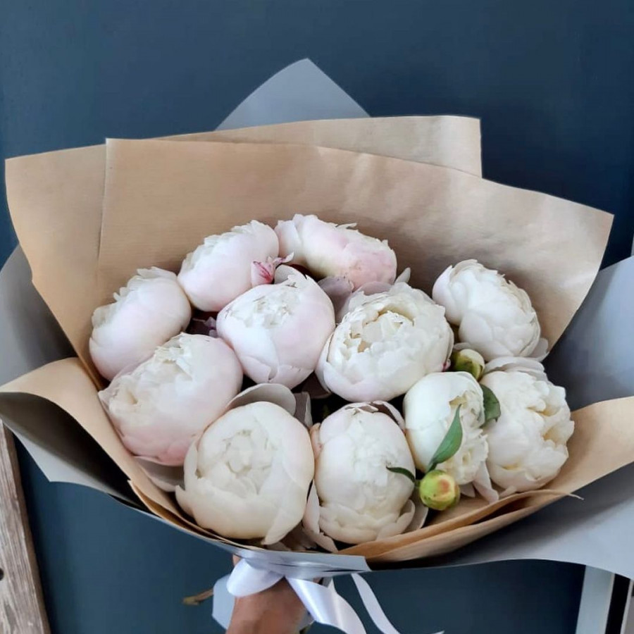 На фото букет из бело-розовых пионов. В составе: пион 11 шт, крафт-бумага 1 шт, атласная лента 1 шт, . Все цветы свежие и ароматные, букет красиво оформлен и отлично подходит для подарка. Доступна доставка цветов или самовывоз.