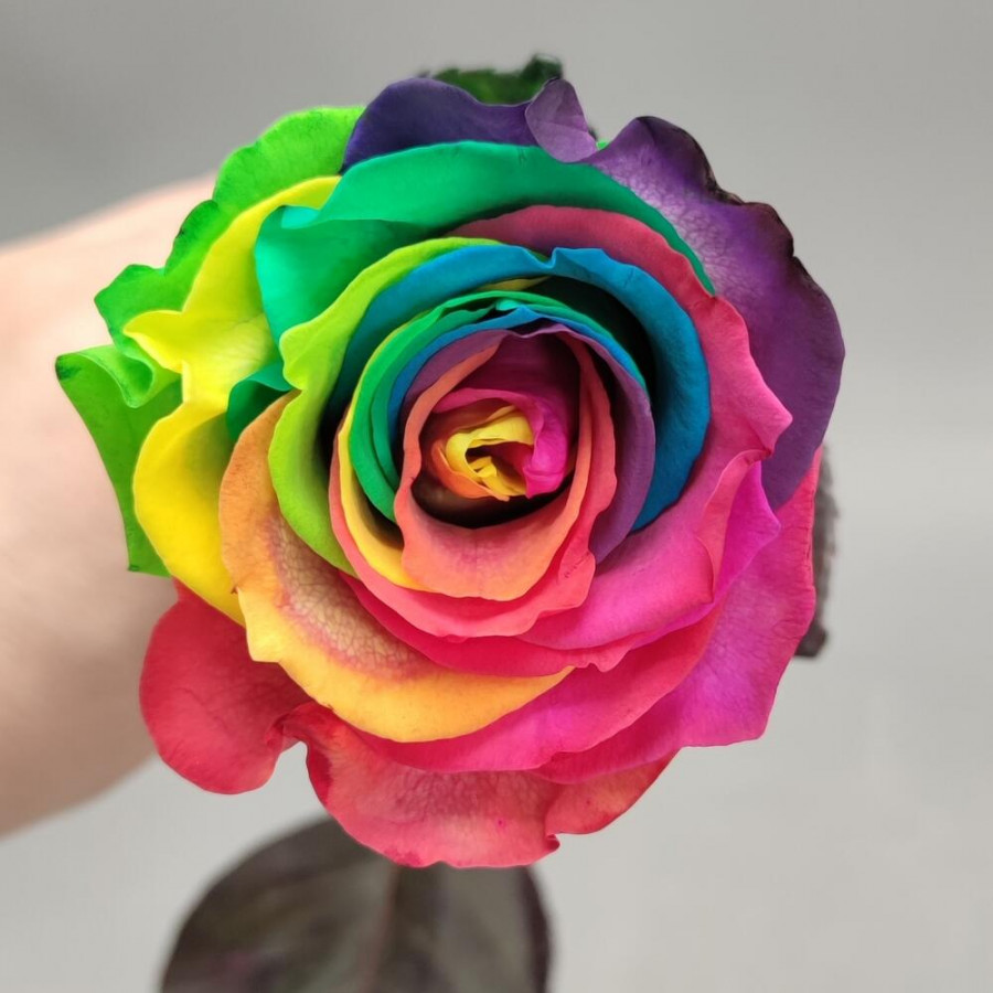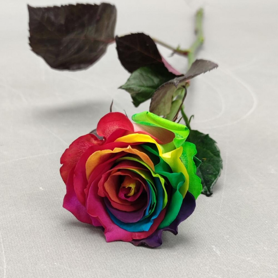На фото радужная роза 1 штука. В составе: роза 1 шт, . Все цветы свежие и ароматные, букет красиво оформлен и отлично подходит для подарка. Доступна доставка цветов или самовывоз.